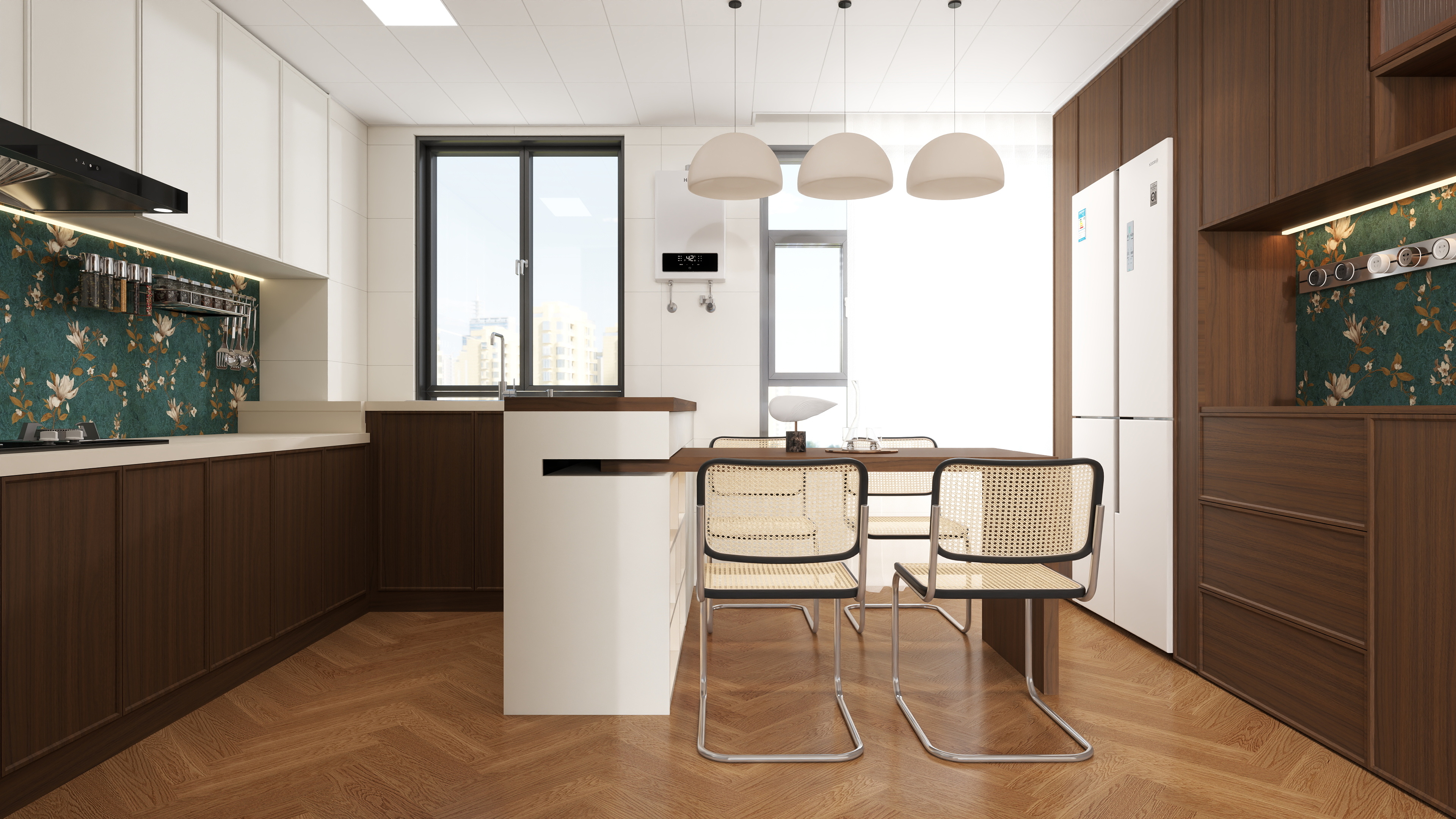餐厨空间别具匠心,胡桃木纹和冰白色调搭配前后呼应,自然惬意,同时点缀墨绿花纹元素,既营造典雅氛围,又增添了几分设计层次,温馨而默契的用餐氛围自然造就。