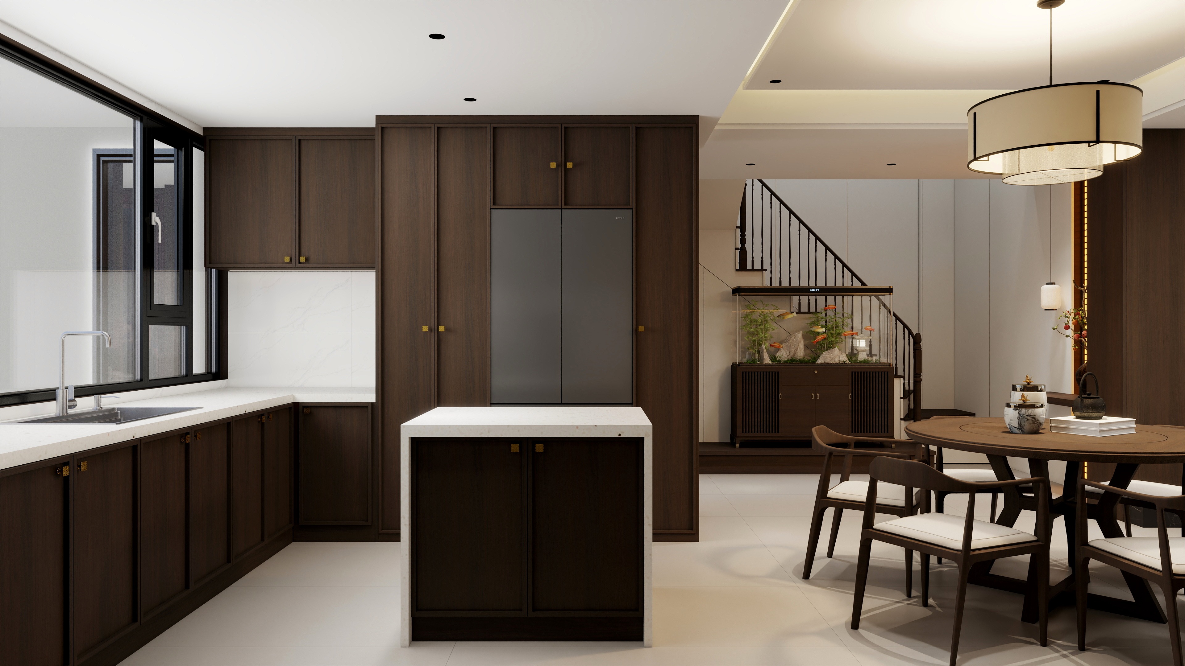 客餐厨一体化设计,增强空间通透感和互动性。圆形餐桌、简约吊灯上下呼应,大片的胡桃木纹元素作墙面装饰,古典韵味十足,实用又美观。