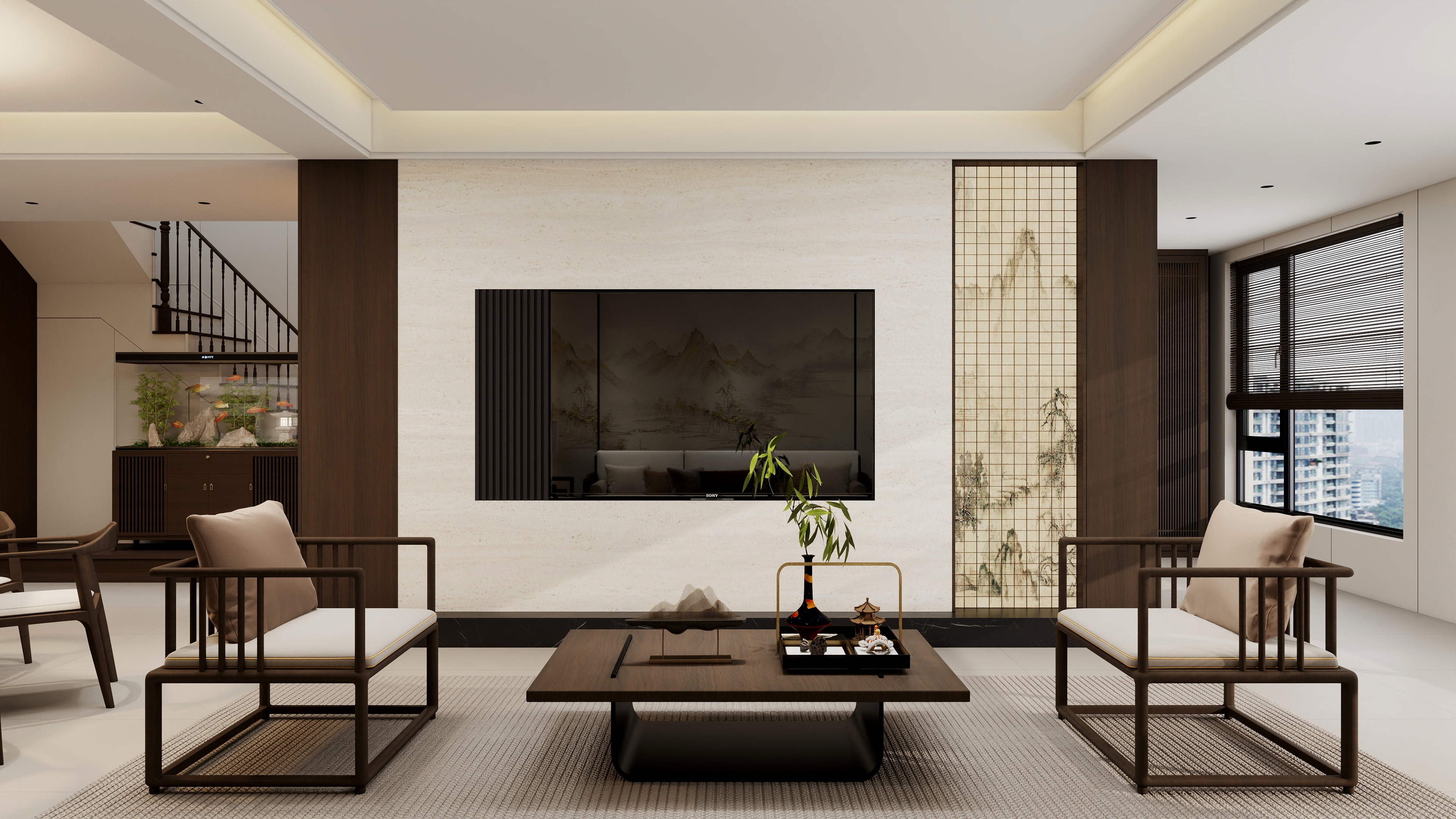 客厅遵循中庸哲学中均衡、适度的和谐美学,山水屏风点缀更显灵动雅致,以简约线条呈现传统的宋氏意韵,营造出一个满溢人文情趣且充满温度的居所。