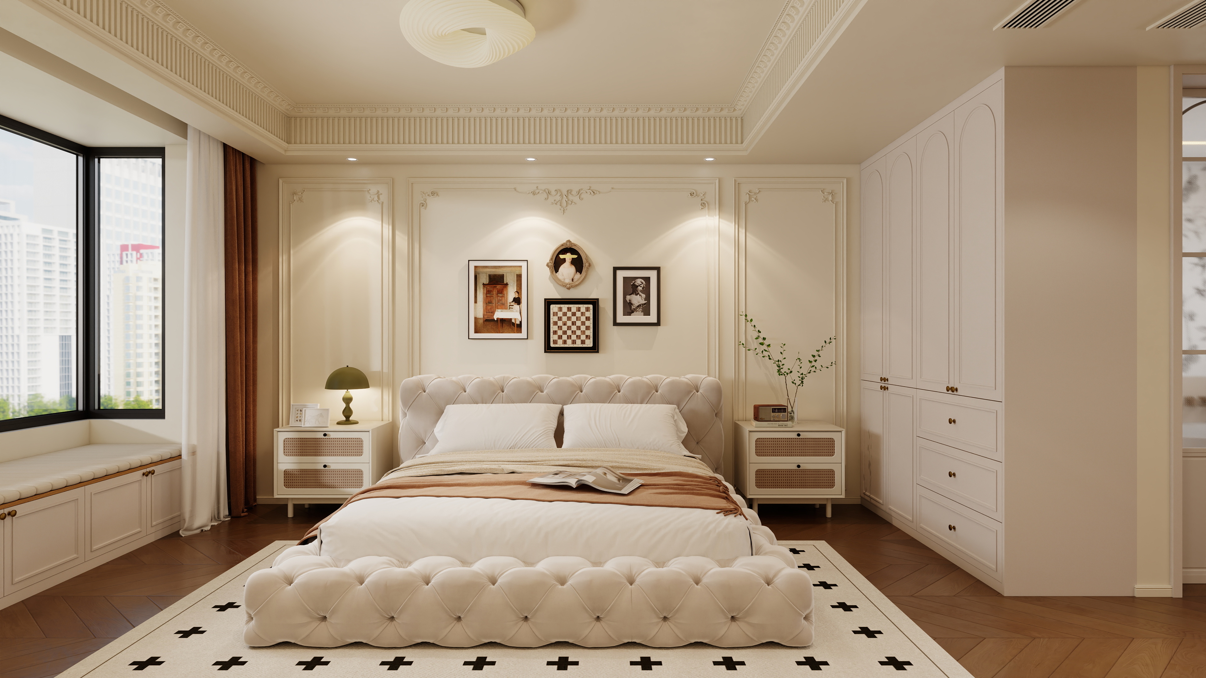 房间内饰通过软装搭配、色彩层次和细节元素,装出浪漫法式氛围感,实现浓郁的法式情调。主卧背景以石膏线勾勒空间轮廓,搭配雾灰的立体雕花门板,巧妙将胡桃木色、局部柔光灯元素融入有限空间,打造“一眼沦陷”的美感。