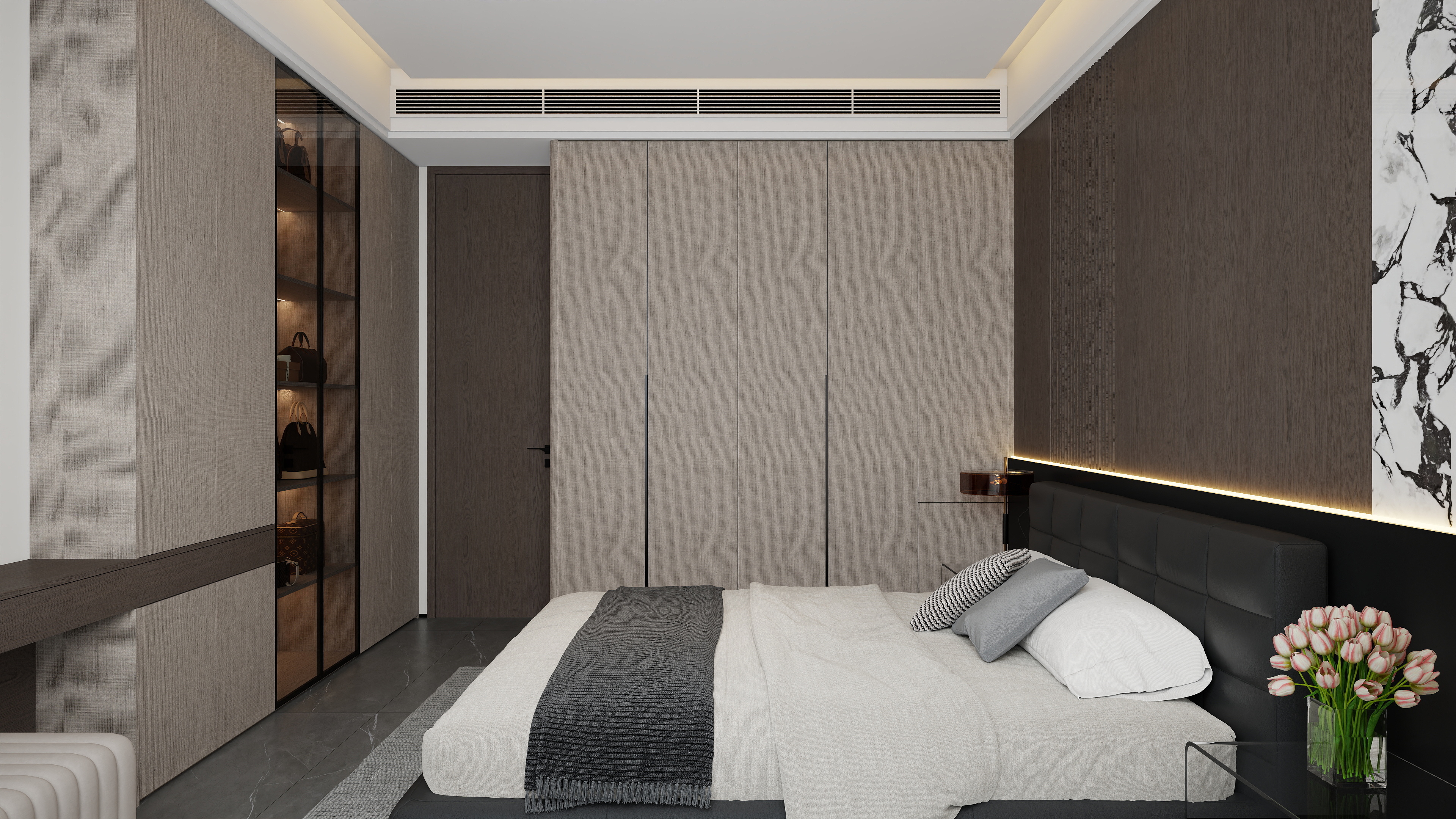 主卧柜体采用XGG303麻痕布艺(深色)+XGG303麻痕布艺(浅色) 花色,皮革床头背景墙兼具质感与实用,将灯膜嵌入空间墙体,光影漫过木质肌理,于井然秩序中漫溢精致优雅的生活哲学。