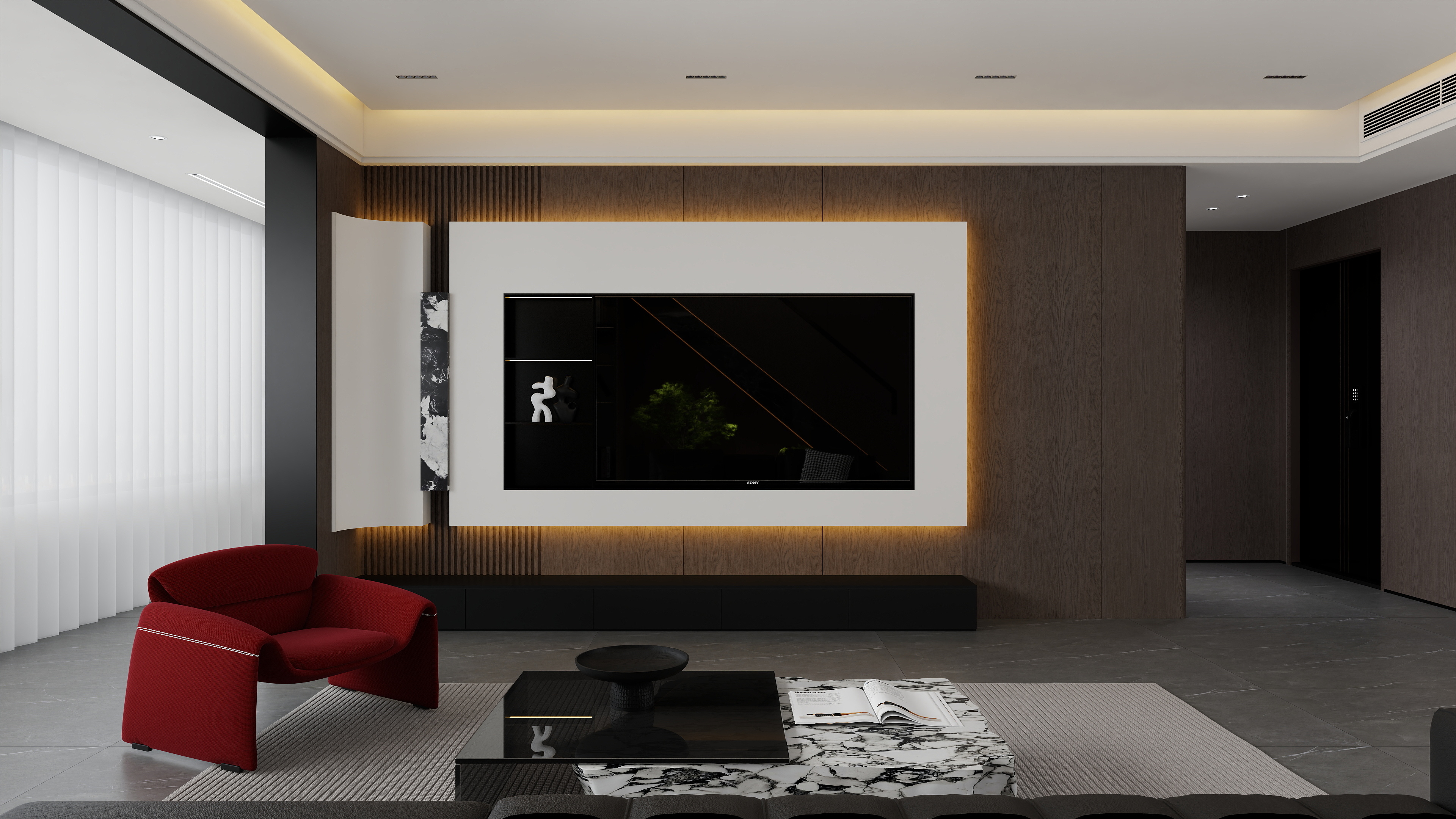 客厅设计上,把背景墙根州灰橡作为视觉焦点,辅以复古红色沙发,构建全新的空间秩序。运用暖色灯带、奢石元素与地板的灰调传递空间情绪,缓和冷色调,打造松弛感。