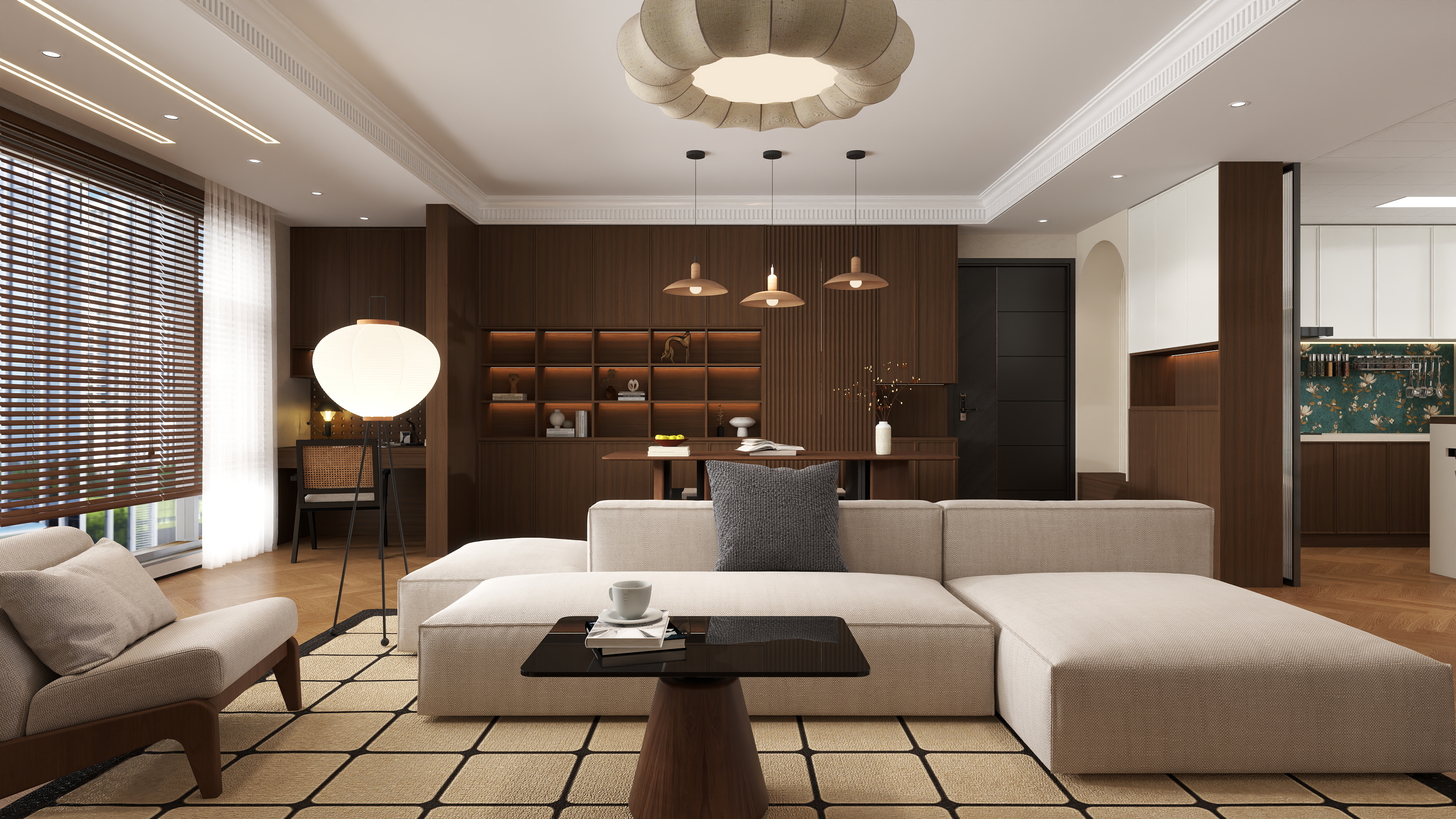 宾州胡桃作为客厅主色块复古质感拉满,加上极具设计感的花朵状圆形吊灯、浅咖色地板,色彩和谐大方,没有过多繁杂装饰,却有种独特的静谧美感。