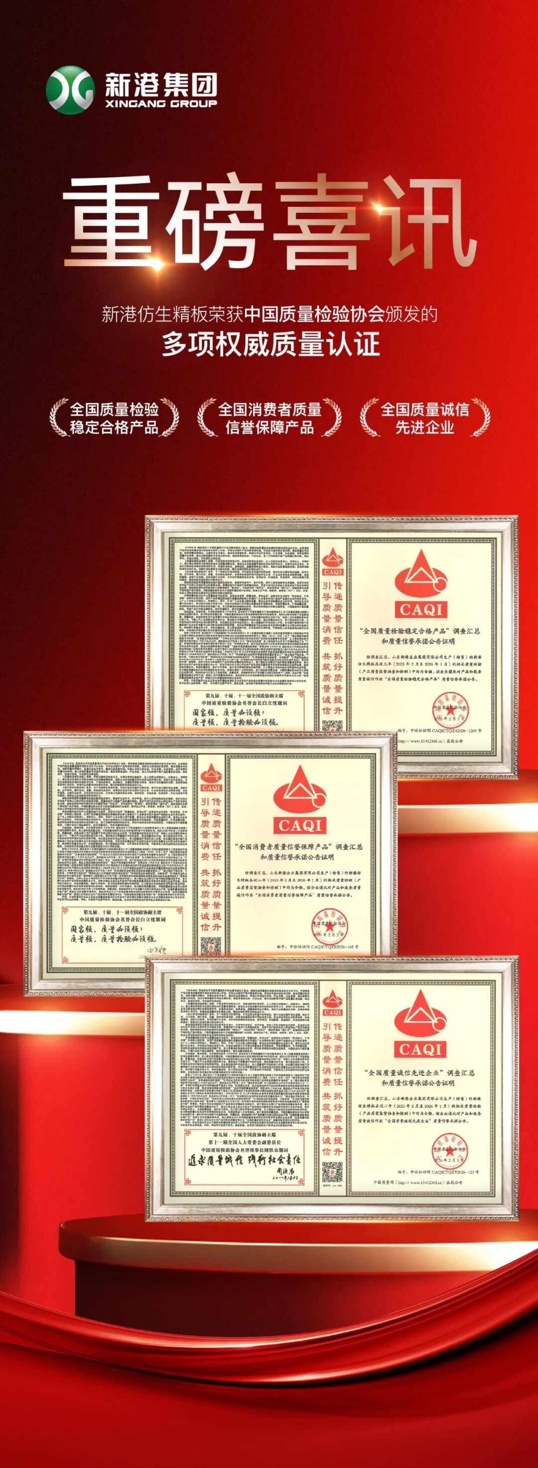 在评选中,协会通过对相关企业的诚信、质量情况进行摸排调查,并结合社会评价,再由权威专家层层严格筛选专业审核。三年磨一剑,积淀出前沿的品质标准。本次评选历经2023-2026年共3年考察,旗下新港仿生精板品质优异,相关质量检验(产品质量监督抽查和检测)均为合格。
