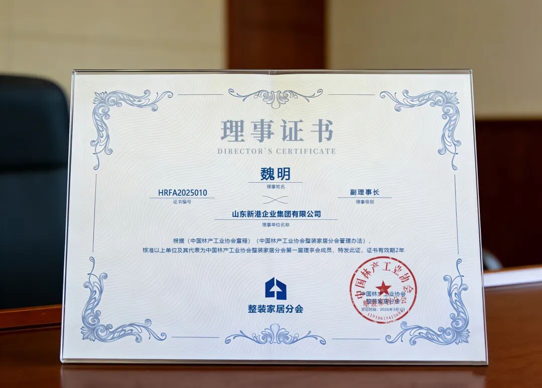 在本届整装家居分会理事会上,新港被正式授予“中国林产工业协会整装家居分会理事单位”证书。这不仅是对新港集团在整装家居领域影响力的高度认可,更是对集团长期以来推动行业健康发展、积极履行社会责任的肯定。