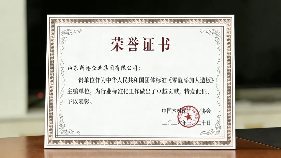 就在同一天,新港凭借在人造板环保标准制定中的突出贡献,荣获由中国木材保护工业协会颁发的《零醛添加人造板》团体标准“主编单位”荣誉证书。在引领行业环保升级的道路上,新港又迈出了坚实的一步。