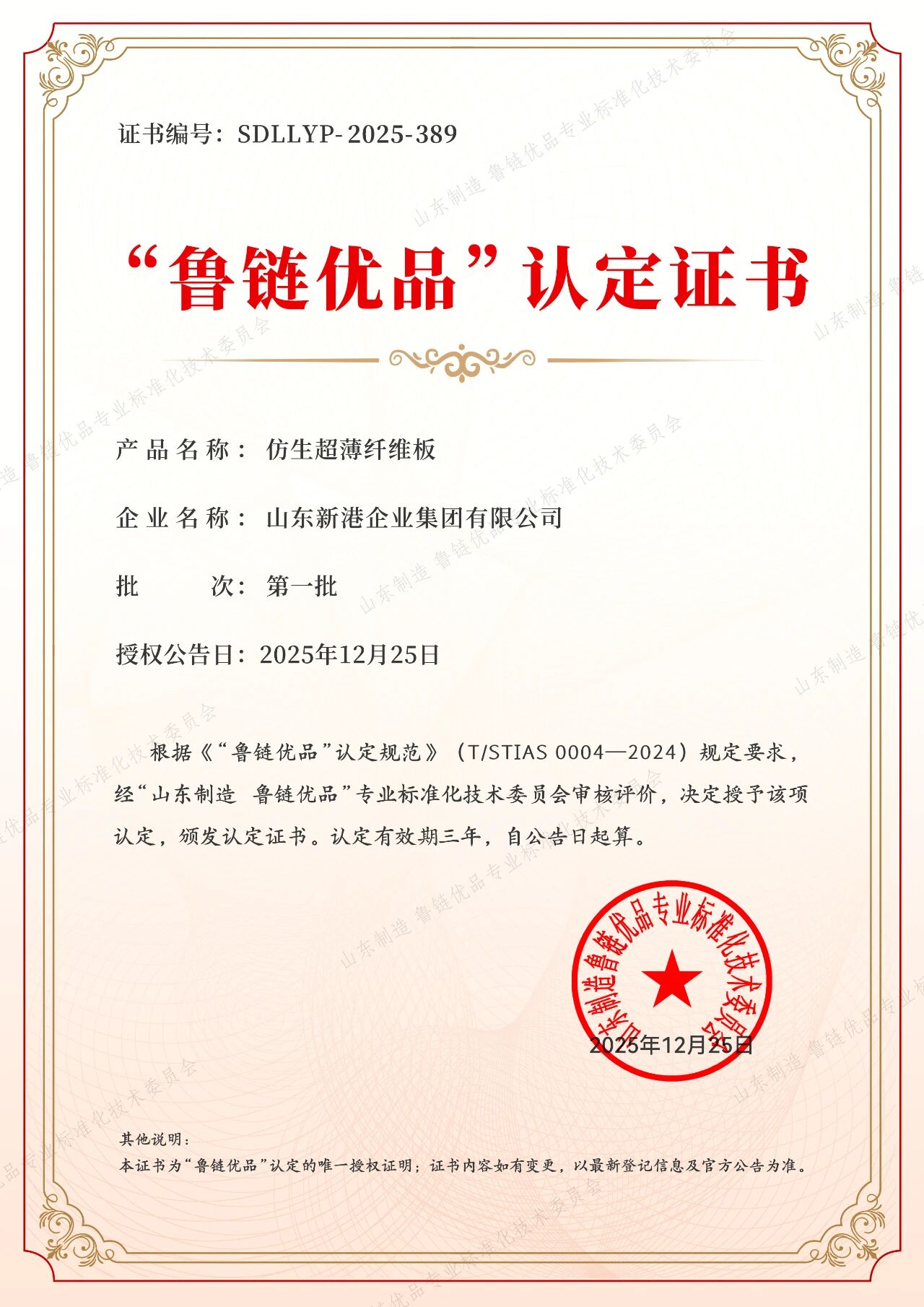12月26日,山东省工业和信息化厅正式公布2025年“山东制造 鲁链优品”名单,新港集团的仿生超薄纤维板实力入选,成为首批获得此项省级权威认证的508项优质产品之一。这标志着新港的创新成果与卓越品质,获得了省级层面的高度认可。