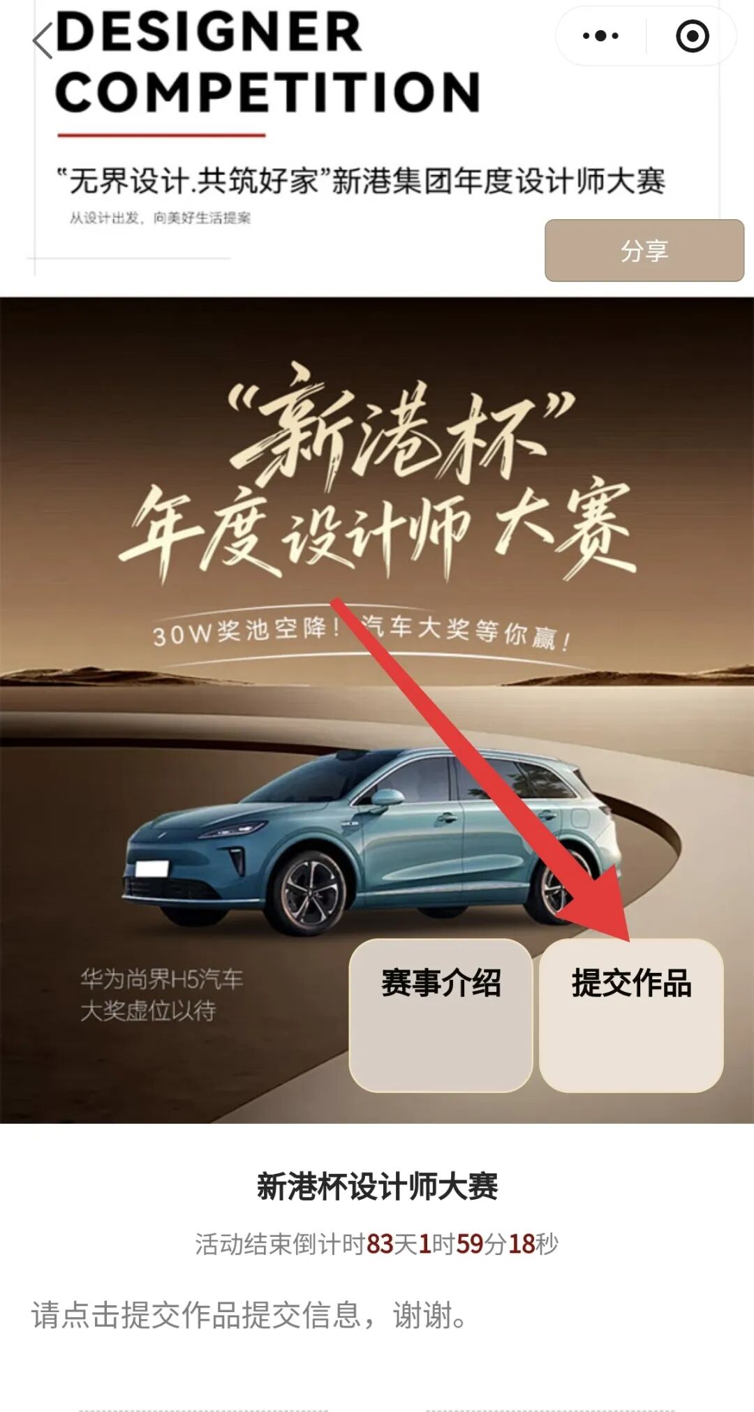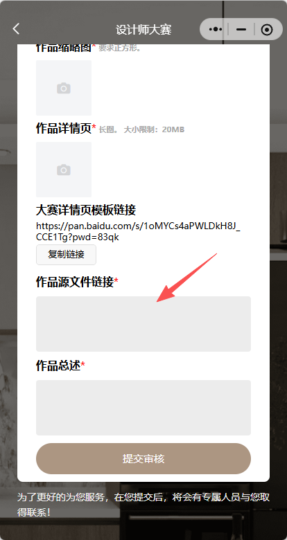 审核通过后返回小程序首页,点击新港杯年度设计师大赛活动页,点击“提交作品”,按照指定模板上传作品。